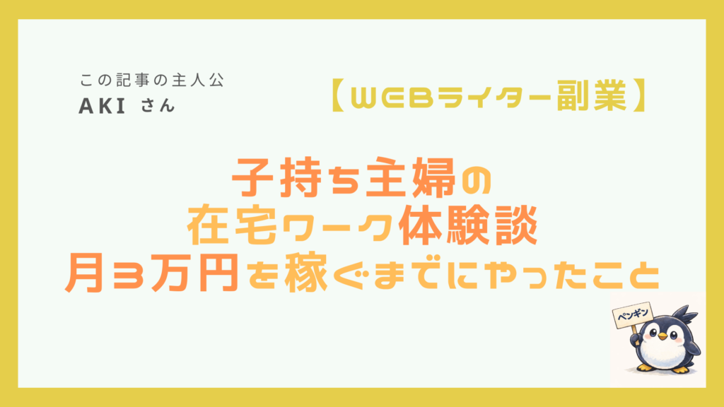 【この記事の主人公 「あき」】 プロフィール名前 : あき年齢 : 35歳 (社会人)副業内容 : Webライティング、ブログ開始時期 : 2021年1月初報酬 : 2021年1月副業月収 : 3万円(最高月収) 「子育て中でも、家にいながらお金を稼ぐ方法はないだろうか?」——... -